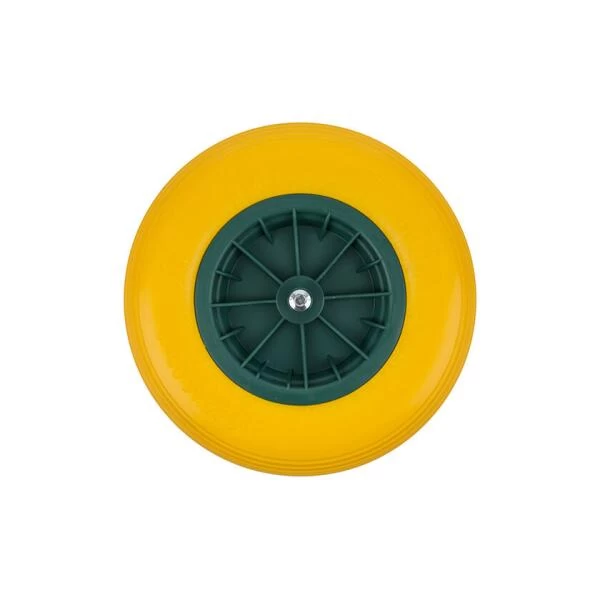 Dit gele kruiwagenwiel met as is een volle band waarbij je nooit meer voor verrassingen komt te staan bij de start van je kluswerk. Door de volle structuur van de band rijd je nooit meer lek.