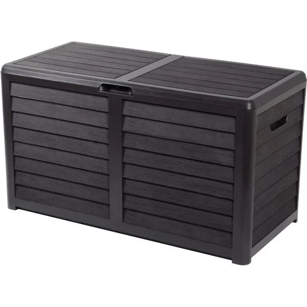 Het scharnierende deksel is voorzien van een oog voor het aanbrengen van een hangslot. Deze eenvoudige koffer, voorzien van twee handgrepen aan beide zijden, kan meteen op het terras, op het balkon of in de tuinberging!