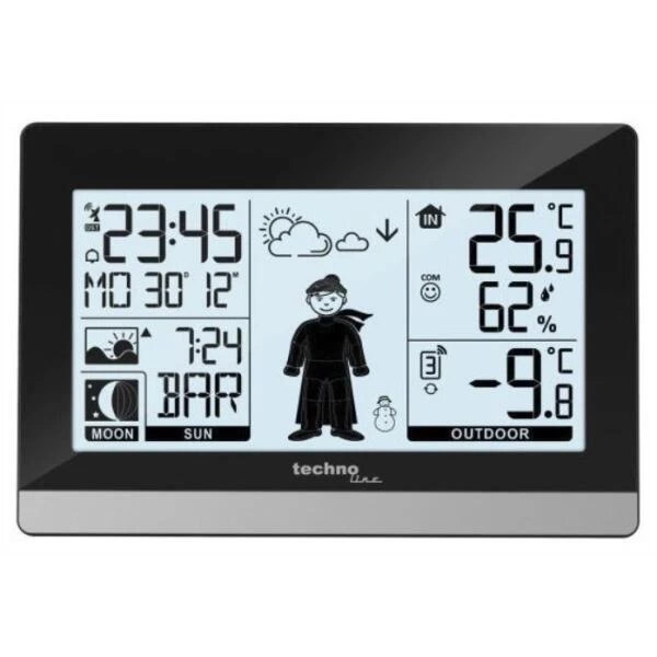 Dit weerstation ‘Weatherboy’ (WS9612) voorziet je van alle nodige informatie omtrent de weersomstandigheden. Het toestel vermeldt de radiografische tijd (DCF-77) maar heeft ook de mogelijkheid tot het handmatig instellen (12/24h tijdsaanduiding). Zowel de binnen- als de buitentemperatuur wordt weergegeven op het display met een minimum en maximum vermelding. Zowel datum als weekdagaanduiding kunnen worden ingesteld in 7 talen. Verder worden de luchtvochtigheid binnenshuis, de maanfase, de zonsondergang en -opgang weergegegen. Het aantal zonne-uren kan worden weergegeven in 165 wereldsteden.